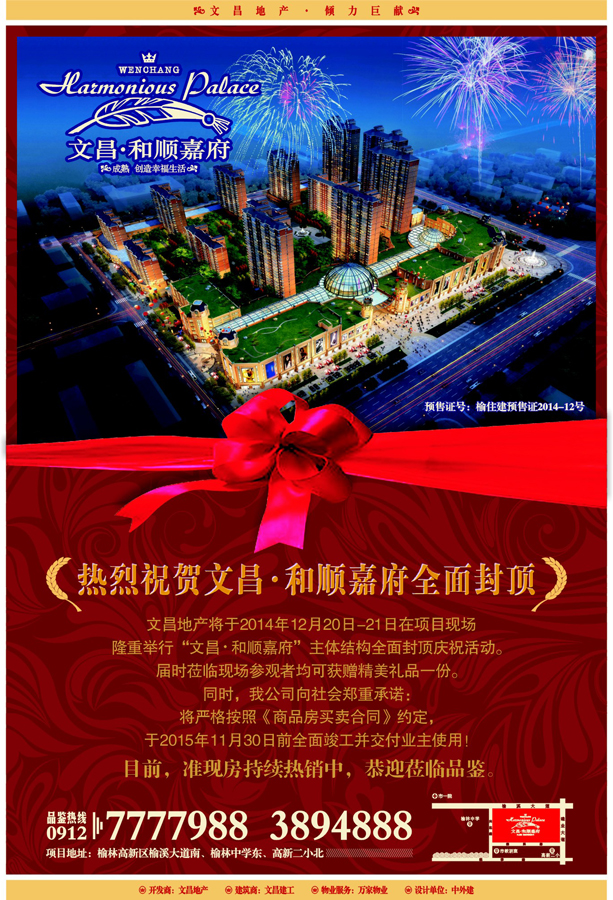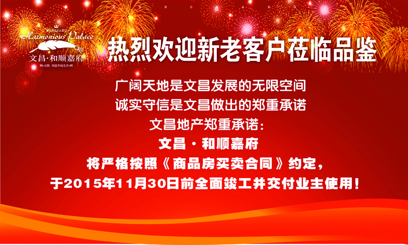 文昌地產(chǎn)將于2014年12月20日-21日在項(xiàng)目現(xiàn)場(chǎng)隆重舉行“文昌.和順府”主體結(jié)構(gòu)全面封頂慶祝活動(dòng)。屆時(shí)蒞臨現(xiàn)場(chǎng)參觀者均可獲贈(zèng)精美禮品一份。同時(shí),我公司向社會(huì)鄭重承諾:將嚴(yán)格按照《商品房買(mǎi)賣(mài)合同》約定,于2015年11月30日前全面竣工并交付業(yè)主使用!