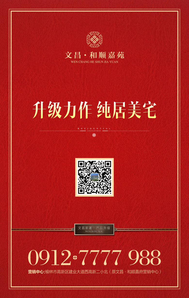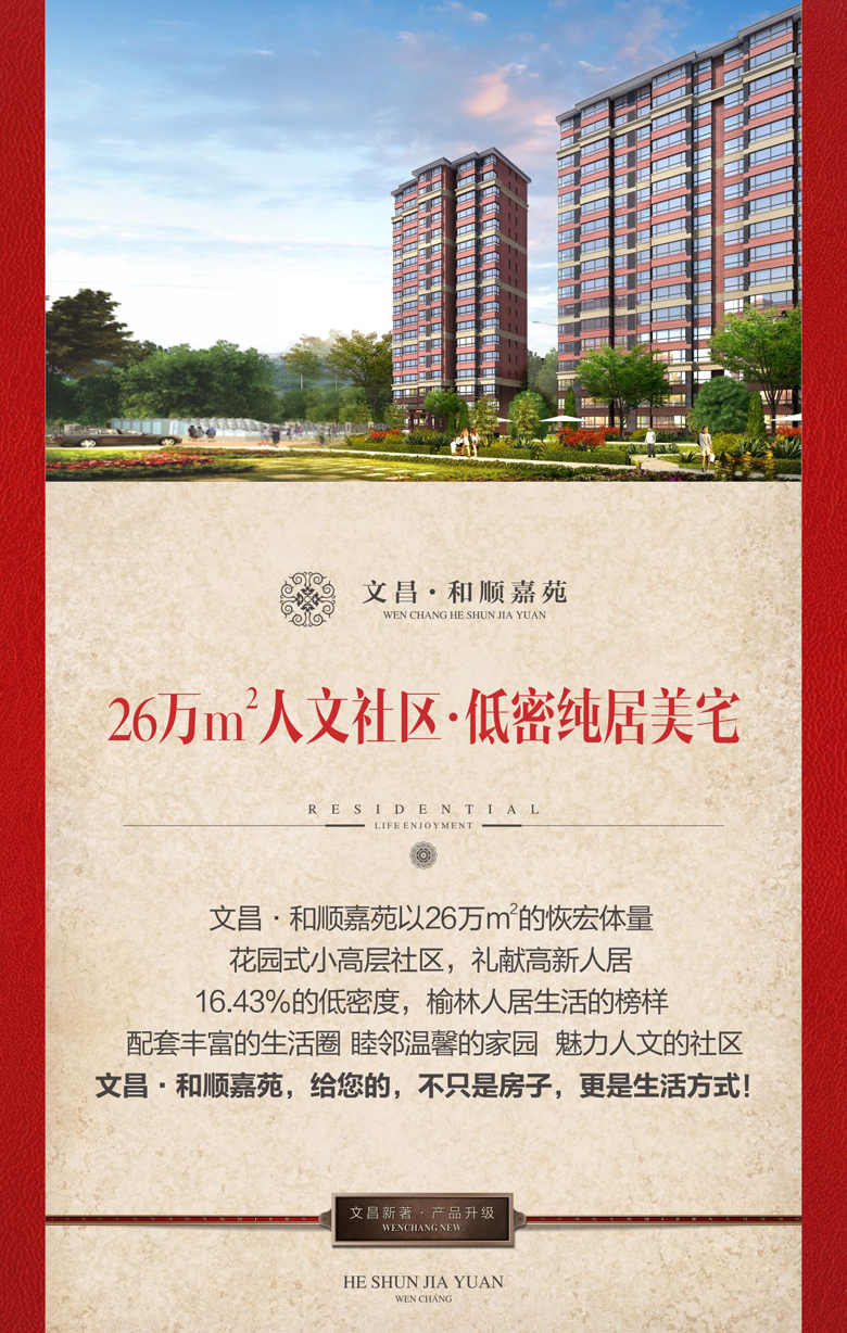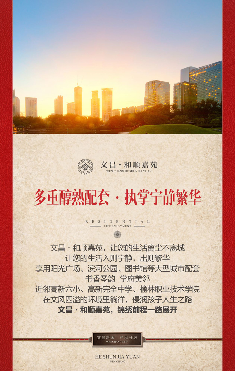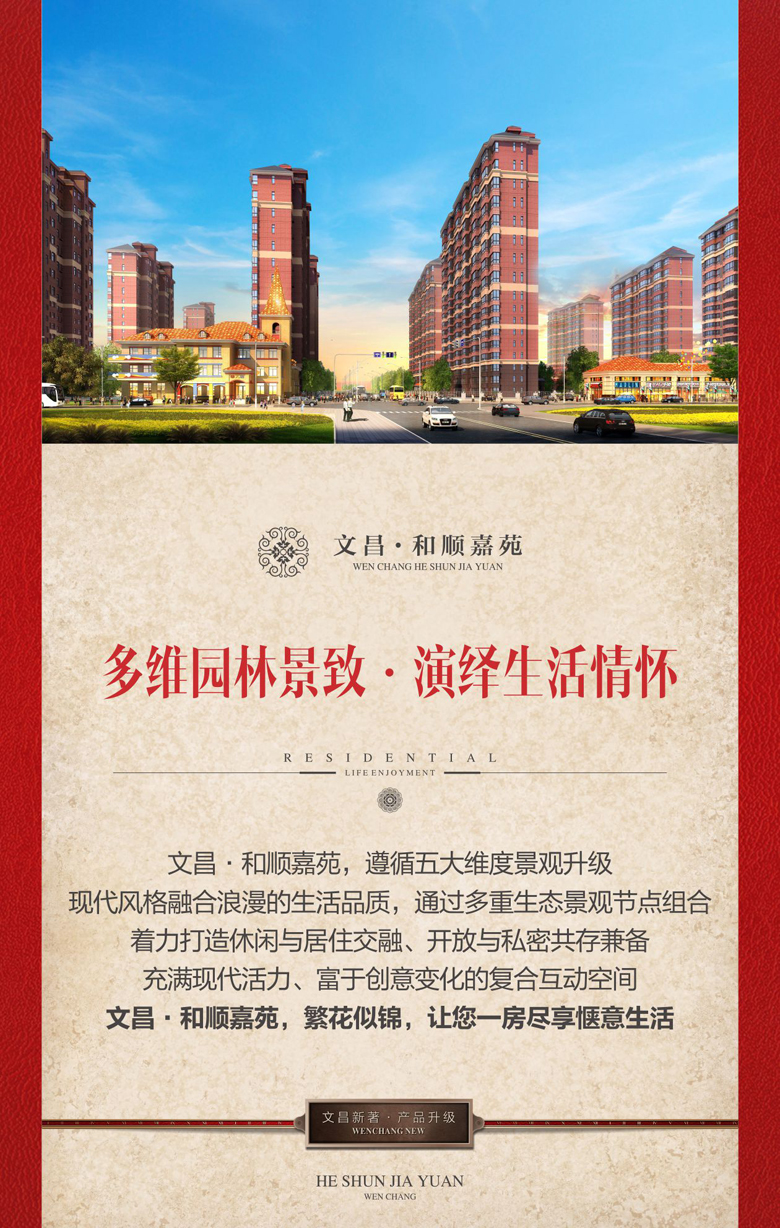您一定期待已久 我們也一直在努力 盡心盡力打造又一部讓您稱心如意的作品 新年來了 金雞報曉 萬象更新 文昌人傾力為您奉上升級力作 ——<和順嘉苑> 位居高新 純居大盤 請您鑒賞!
